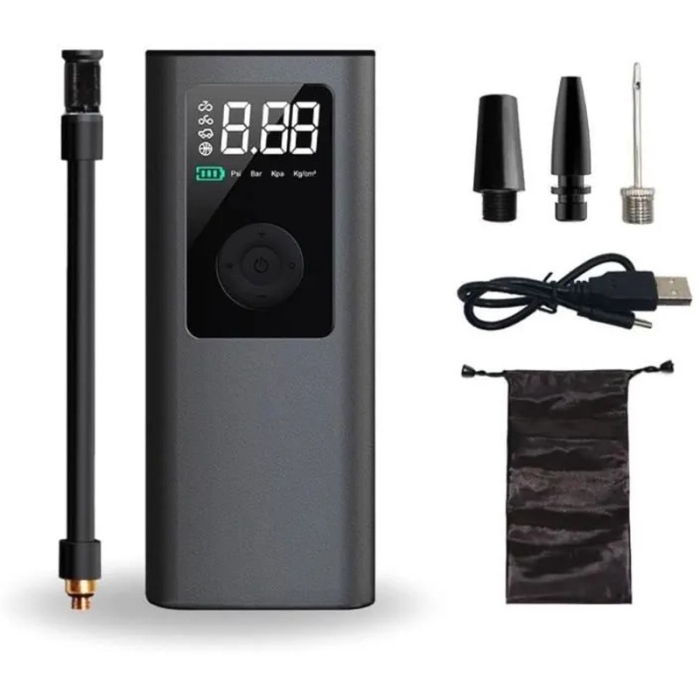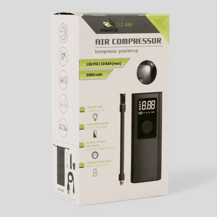 Le compresseur d’air portable LLTZ-668 est compact, multifonction et idéal pour tous vos trajets. Il permet le gonflage rapide et facile de pneus de voiture et de vélo, ainsi que de ballons et de matelas. Équipé d’un écran digital avec arrêt automatique, il assure une mesure précise de la pression, pouvant atteindre un maximum de 150 PSI / 10 Bar. Sa taille compacte permet de le ranger facilement dans la boîte à gants, tandis que la lampe LED intégrée facilite son utilisation de nuit. Sa batterie intégrée de 2000 mAh offre une longue autonomie et il peut également servir de Power Bank pour recharger vos appareils. Conçu pour un usage simple et efficace, il s’adapte à différents types d’articles sportifs et pneumatiques.