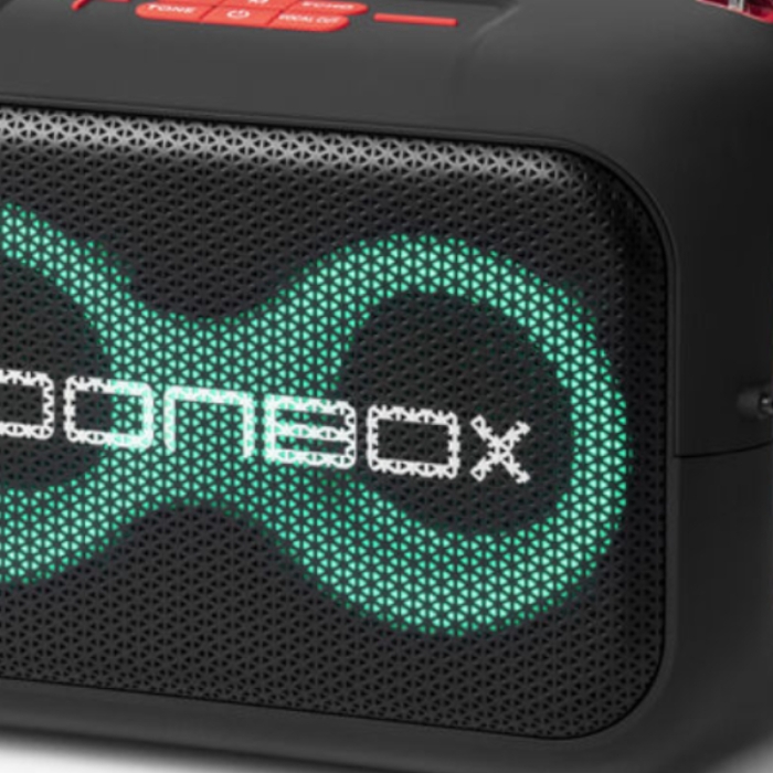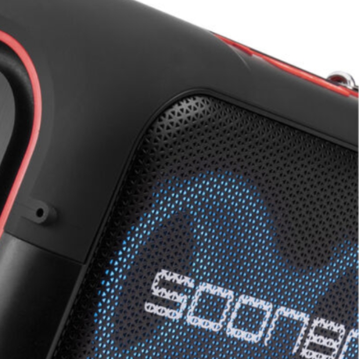 L’enceinte est également équipée d’un éclairage LED coloré, projetant des effets lumineux dynamiques qui instaurent instantanément une ambiance festive.