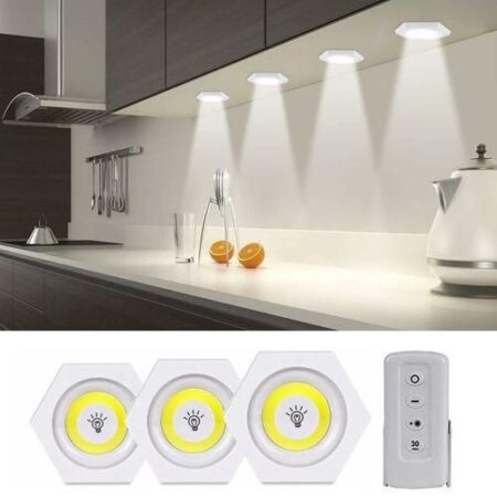 • Ces sites sont économiques et respectueux de l’environnement. L’ensemble de 3 lumières LED sans fil avec télécommande comprend un système de montage autocollant. Avec cette lampe LED sans fil, vous aurez de la lumière dans tous les endroits qui ne disposent pas d’installations électriques.