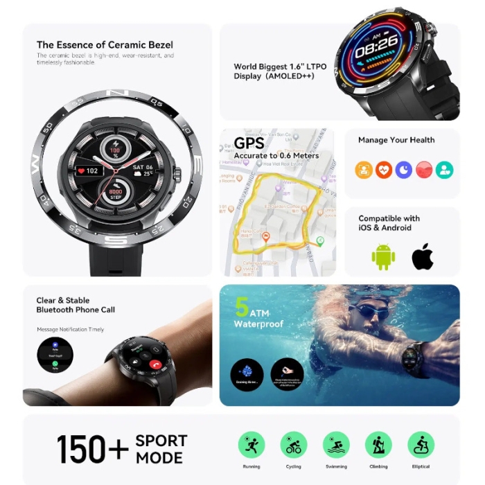 Elle propose plus de 150 modes sportifs, dont la marche en plein air, la course à pied et le travail sur machine elliptique, et offre une étanchéité certifiée 5 ATM, ce qui la rend adaptée à une utilisation quotidienne y compris dans l’eau.
