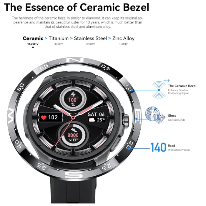 - Bague en céramique renforcée en 140 étapes, dureté de 1 500 HV (proche du diamant)