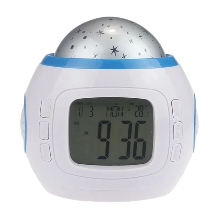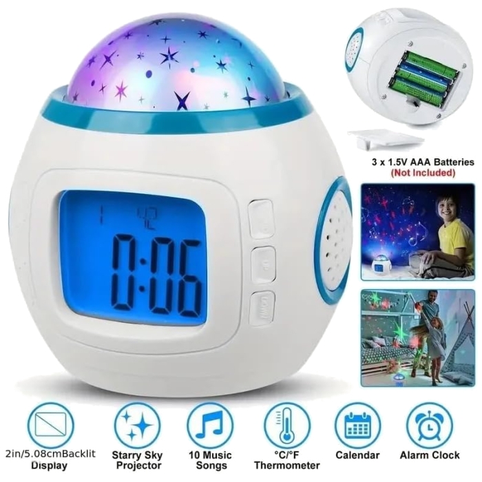 Grâce à sa projection colorée d’étoiles et de lune, il transforme les murs et le plafond en un ciel étoilé relaxant, idéal pour s’endormir paisiblement. Il dispose de 10 mélodies intégrées pour un réveil tout en douceur, avec une fonction Snooze permettant de répéter l’alarme toutes les cinq minutes.
