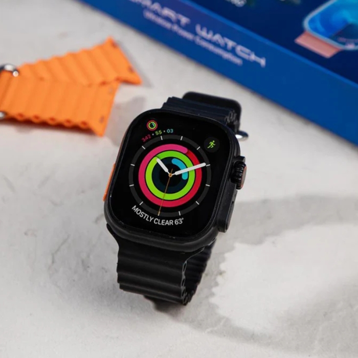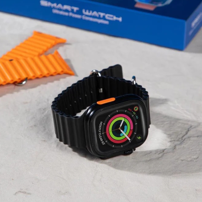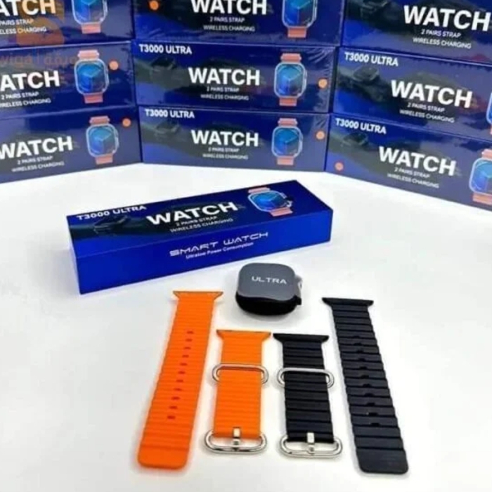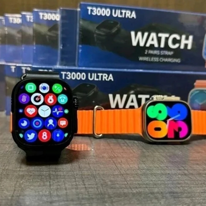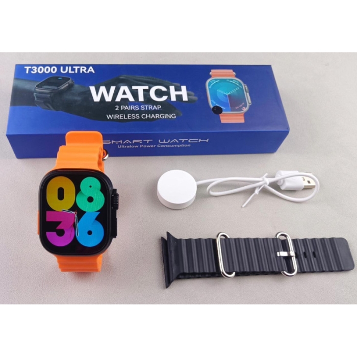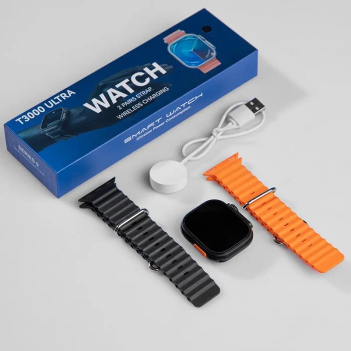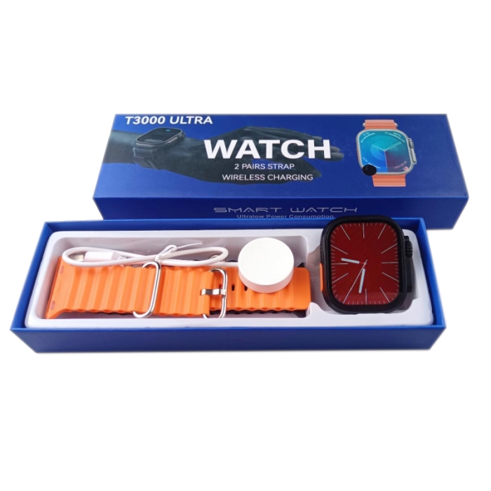 La Smart Watch T3000 Ultra est équipée d’un écran HD de 49 mm (1,99–2,08 pouces, résolution 240×296) et d’un design robuste en aluminium spatial. Elle est livrée avec deux bracelets interchangeables (noir et orange). Dotée d’une recharge sans fil rapide, de trois boutons actifs et d’une résistance à l’eau IP67, elle est compatible aussi bien avec Android qu’avec iOS.