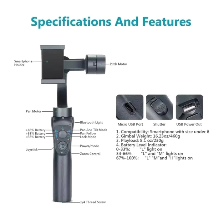 - Stabilisation sur 3 axes : Technologie anti-tremblement pour des vidéos fluides et sans secousses.