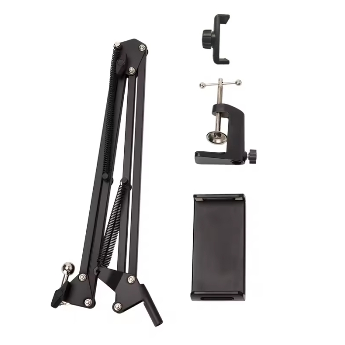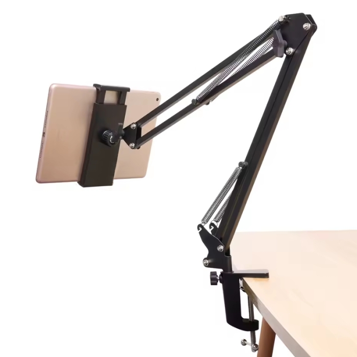 Le support de tablette et smartphone en métal est réglable et polyvalent, idéal pour une utilisation au bureau ou au lit. Il offre une rotation à 360° et des angles ajustables pour un confort d’utilisation optimal. Ce support est équipé de deux pinces de montage : une pour tablette (largeur 12 à 13,5 cm) et une pour smartphone (largeur 6 à 9 cm), adaptées à de nombreux usages tels que la diffusion en direct, les vidéos en ligne, l’enseignement, les démonstrations, le bricolage, le dessin, le croquis ou l’enregistrement. La pince de montage sur table est robuste, dotée d’un coussinet anti-rayures et d’une ouverture jusqu’à 4,5 cm pour un maintien sûr. Son cadre en métal durable, associé à des ressorts solides, supporte jusqu’à 2 kg (4,4 lb) sans grincements. Le bras articulé pliable permet de libérer de l’espace sur le bureau et peut être facilement clipé ou détaché. Son design stable et optimisé assure une utilisation intensive et durable.